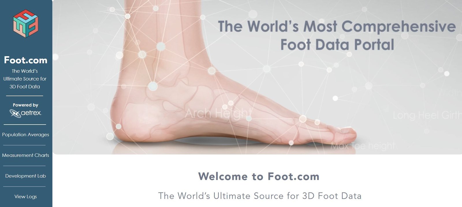 Foot.com allows users to view and extract global 3D foot data organized by gender, foot size, country and other demographics. Once desired filters are set, users can collect detailed measurements from the foot scans and use the data to create better-fitting and functioning shoes.